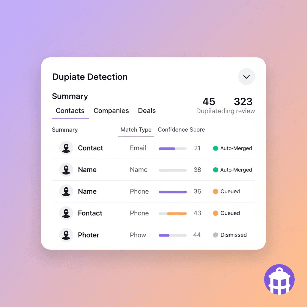 Duplicates detected using fuzzy matching across name, email, phone, and company — merged automatically or queued for review with a confidence score