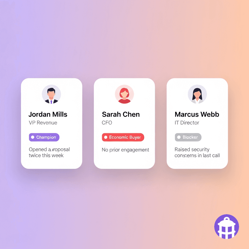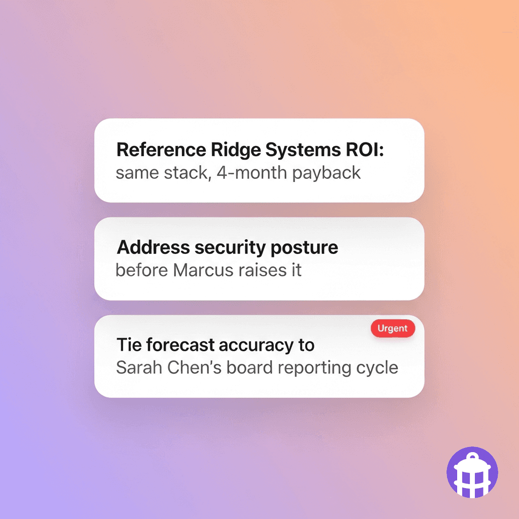 Talking points are tailored to the deal stage in the CRM and grounded in account-specific context — not generic sales playbook advice.