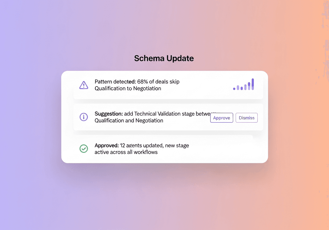 Out-of-the-box data models force your business into someone else's schema. Your CRM says deals go Qualification → Negotiation, but your reps run a Technical Validation step in between that doesn't exist in the system. Your team calls a certain type of intent signal a "budget unlock" — no vendor's taxonomy includes that. The Ontology detects these gaps from usage patterns and proposes schema updates. When your team overrides a signal classification or skips a deal stage, the system learns what those patterns mean for your business specifically and suggests structural changes. Approve them and every agent immediately operates on the updated model.