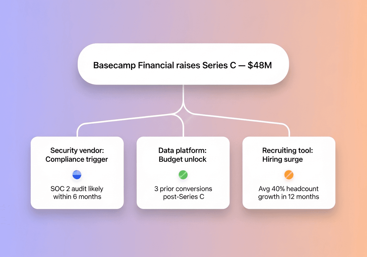 A Series C means different things to different companies selling different products. For a security vendor, it's a compliance trigger — the company just hit the size where SOC 2 becomes mandatory. For a data platform, it's a budget unlock — new money, new infrastructure spend. For a recruiting tool, it's a hiring surge. Generic intent platforms assign one score to one event. The Ontology classifies signals based on your industry, your ICP, your competitive landscape, and your historical conversion patterns. The same event gets a different weight, a different classification, and a different downstream action depending on whose Ontology it's in.