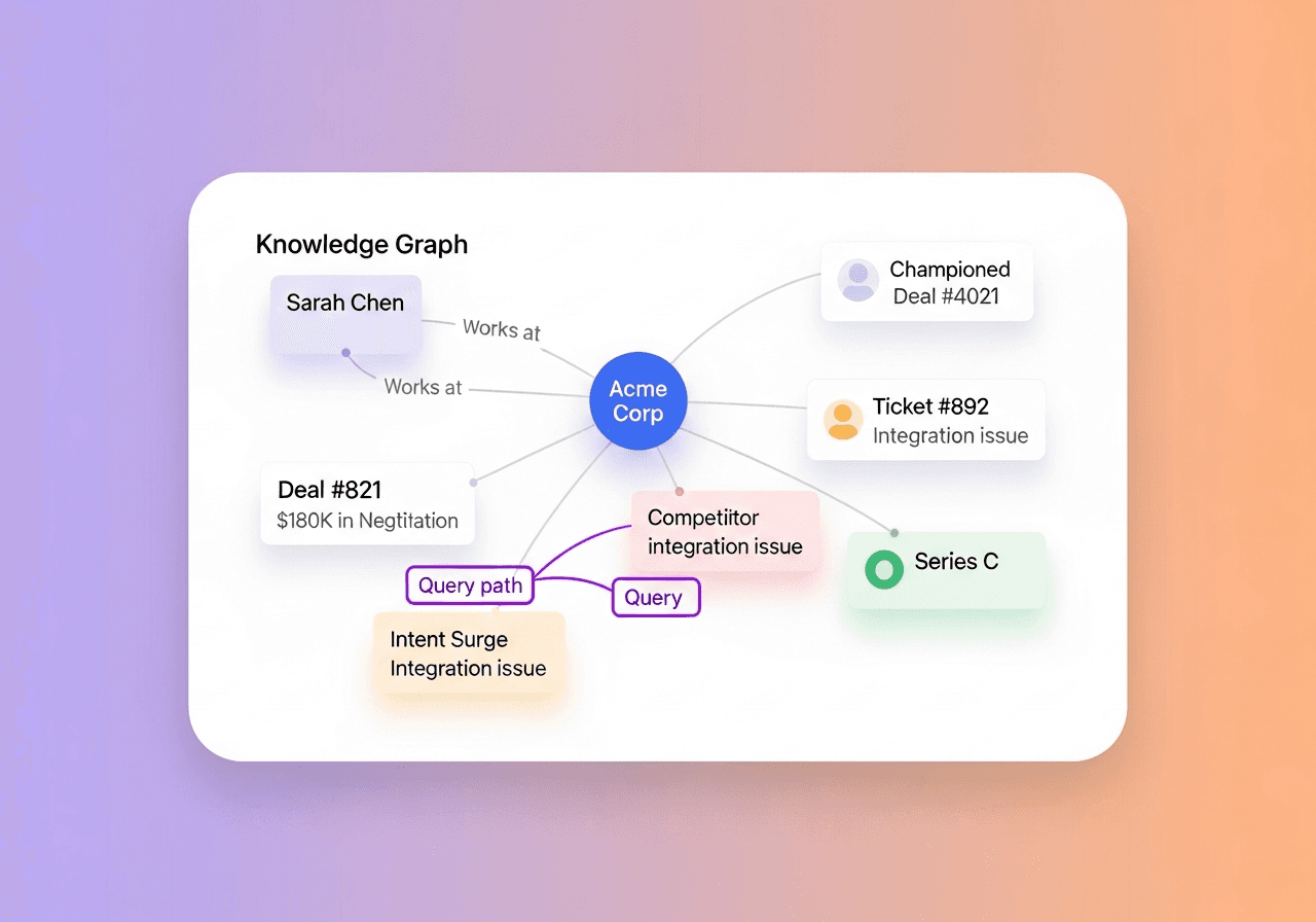 An AE wants to know: which accounts have a champion who opened a support ticket about a competitor in the last 90 days, are in an active deal above $100K, and showed an intent surge this quarter? Today that's three system exports, a VLOOKUP, and an hour. The Ontology stores relationships natively — person-to-company, person-to-deal, deal-to-signal, signal-to-account — so that query runs in seconds against the graph. Agents don't reconstruct context by joining CSVs. They read it directly.