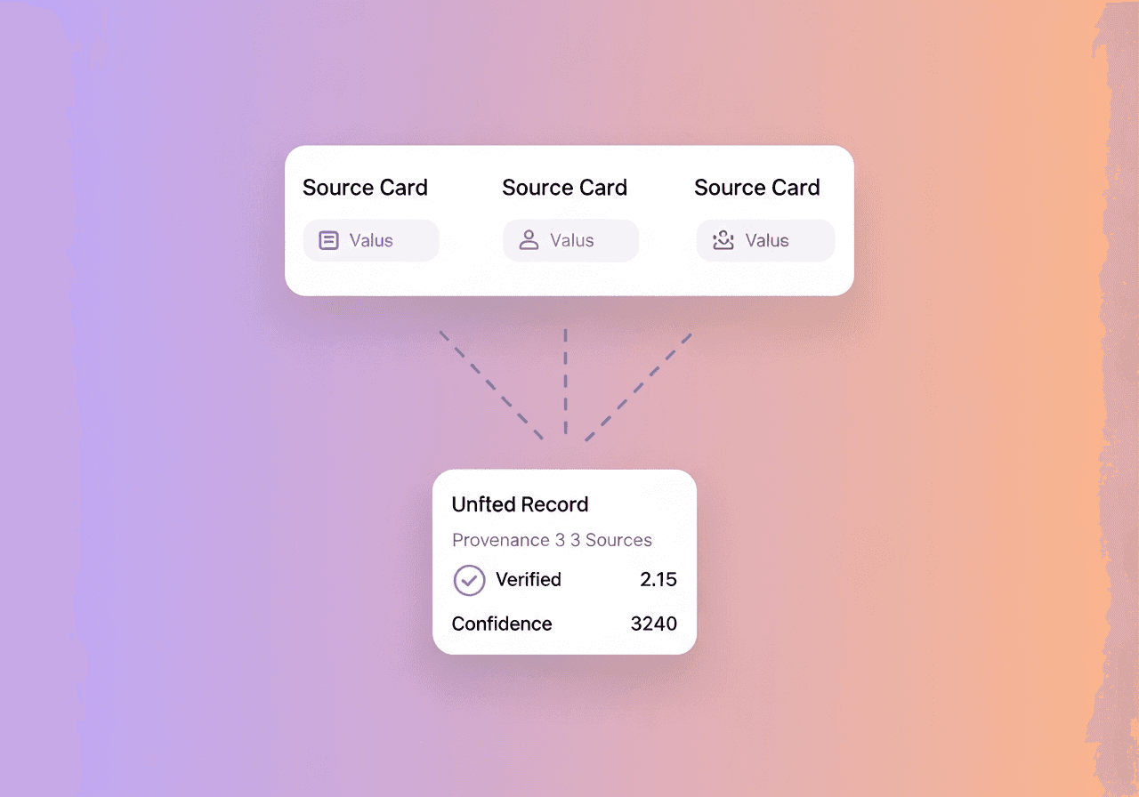 Your CRM says Acme Corp has 1,200 employees. Your enrichment provider says 1,450. Your intent vendor has them under a subsidiary name your CRM doesn't recognize. The Ontology resolves these — matching entities across name, domain, phone, title, company, and behavior, then merging them into one record with provenance on every field. Clear matches merge automatically. Ambiguous cases surface for review. Every merge is reversible. The result isn't a "master record" that overwrites everything — it's a graph where every value has a source, a timestamp, and a confidence score, and the best answer wins.